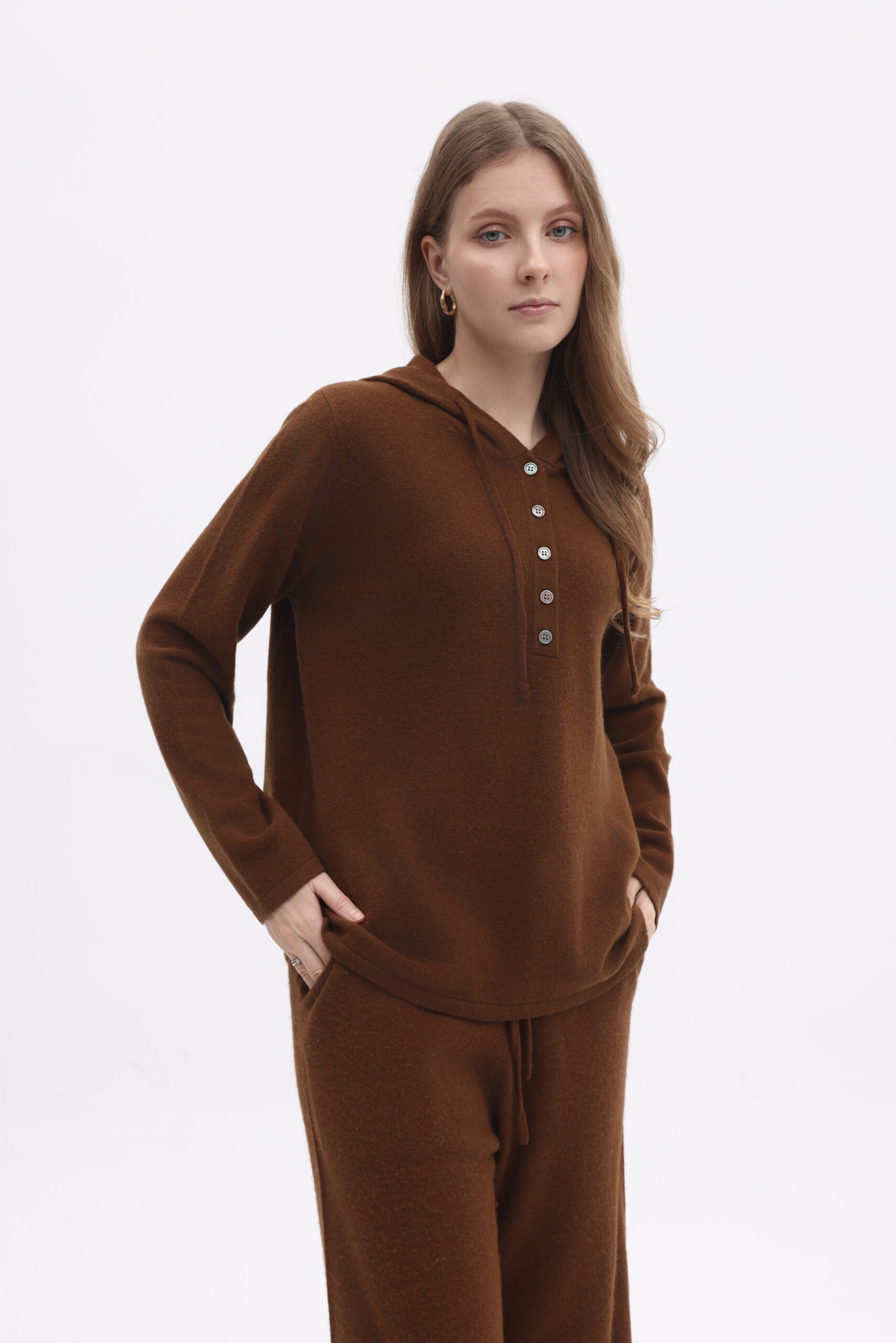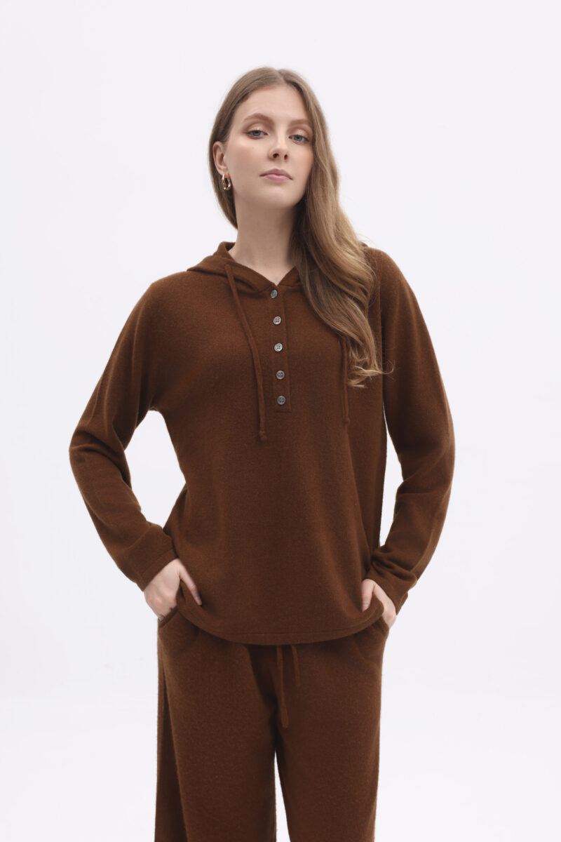 Confectionné en cachemire premium 100 %, ce pull à capuche à manches longues offre une douceur exceptionnelle, une chaleur enveloppante et une respirabilité naturelle. Sa silhouette décontractée, à la fois souple et raffinée, allie confort et élégance au quotidien. La maille fine révèle un toucher lisse et luxueux tout en conservant légèreté et isolation thermique naturelle.